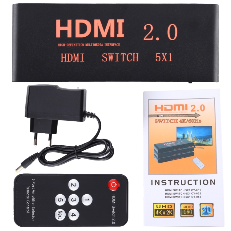 5X1 4K/60Hz HDMI 2.0 Switch with Remote Control, EU Plug