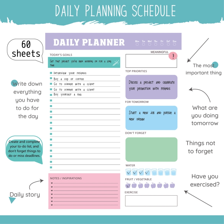 1. Contains today’s list, tomorrow’s goals, key priorities and important notes, etc., with fresh printing colors, clear printing and simple style.
