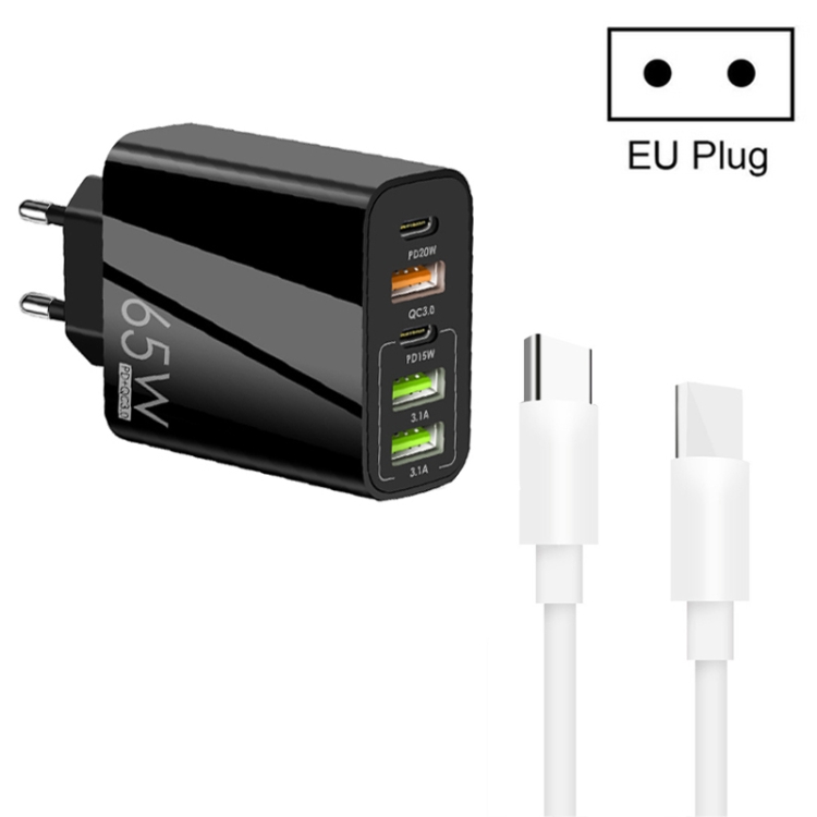 65W Dual PD Type-C + 3 x USB Multi Port Charger with 3A Type-C to Type-C Data Cable, US Plug