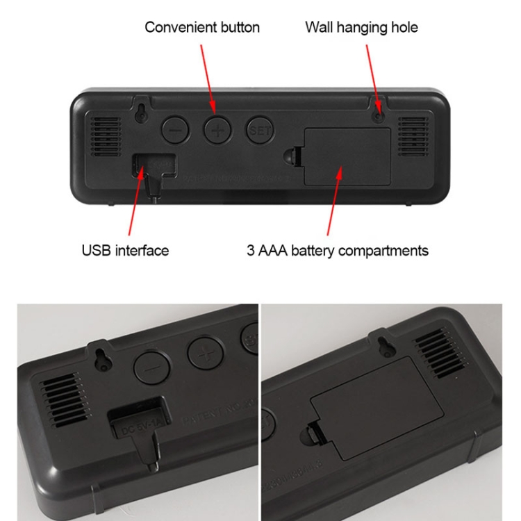 3. High-definition LED display: date (year/month/day displayed on the same screen), temperature, humidity, time (12/24 hour conversion)