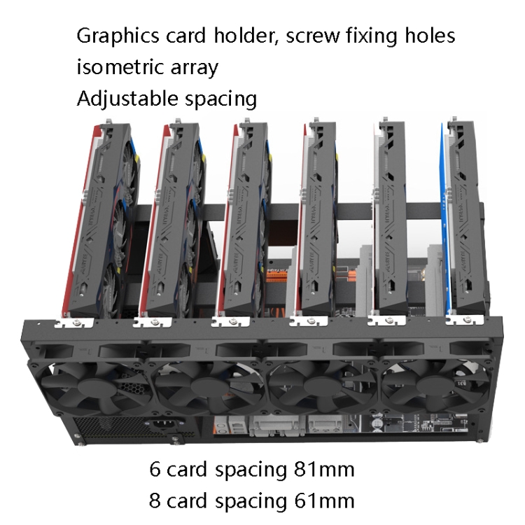 5. The graphics card holder and screw fixing holes are equally spaced array, with adjustable spacing, 6-card spacing 81mm, 8-card spacing 61mm