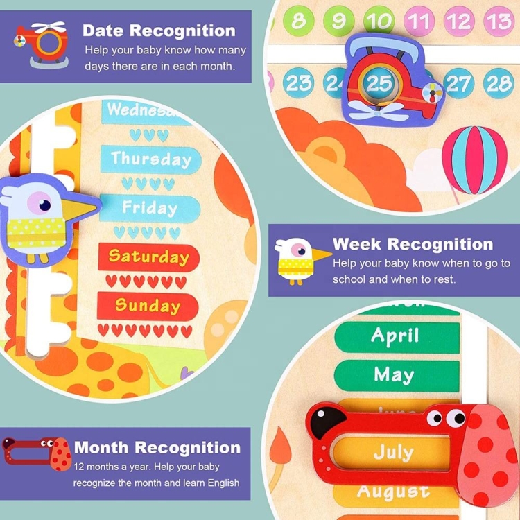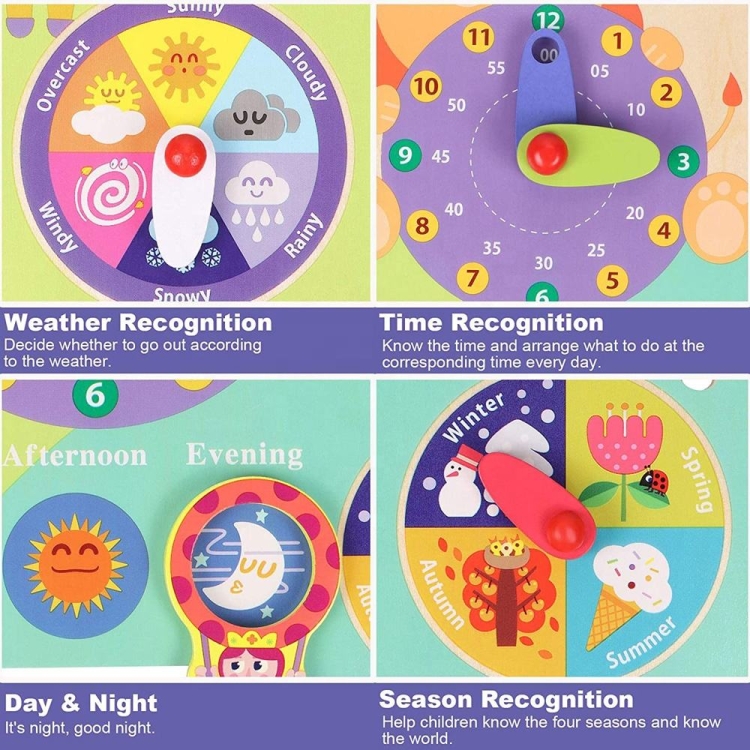 1. As a 7-in-1 learning toy for kids, kids will master the number of days in a month, months in a year, Monday to Sunday, weather, seasons, and morning vs. afternoon and evening.