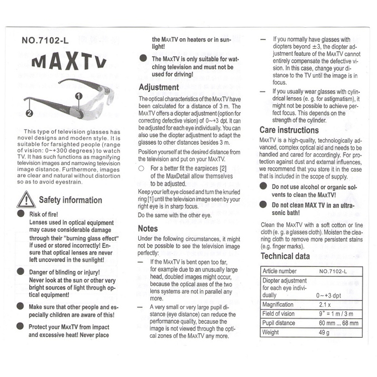 4. New: Easy grip, focusing wheel; 2.1X magnification of the television screen. Maximize your screen with special TV-glasses.
