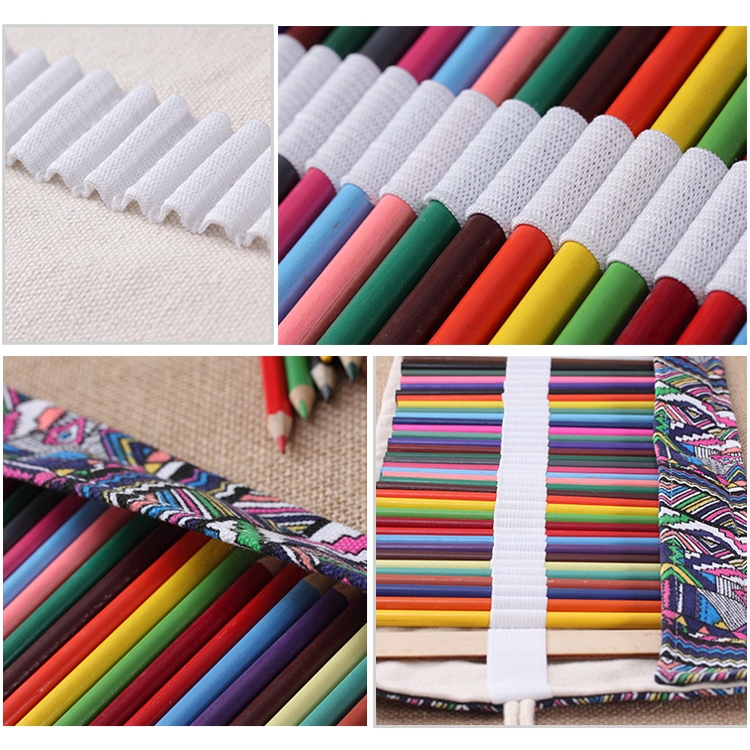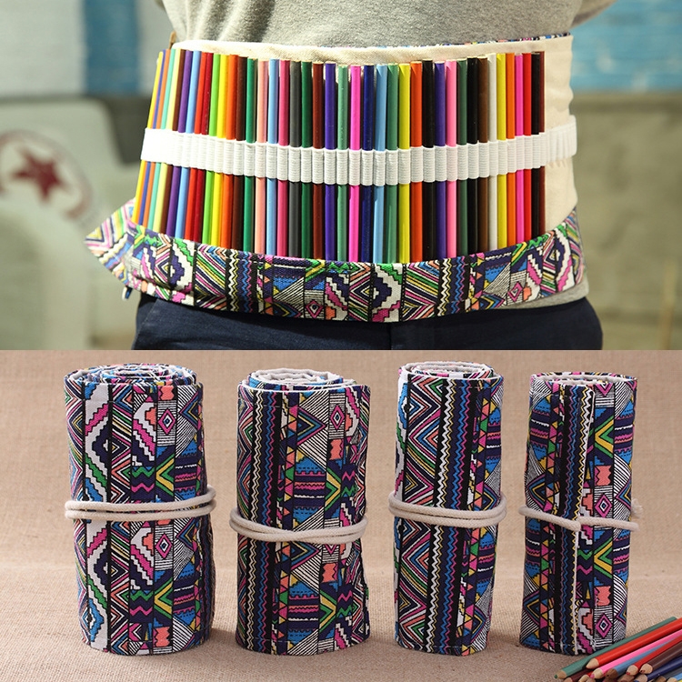 72 Slots Ethnic Print Pen Bag Canvas Pencil Wrap Curtain Roll Up Pencil Case Stationery Pouch