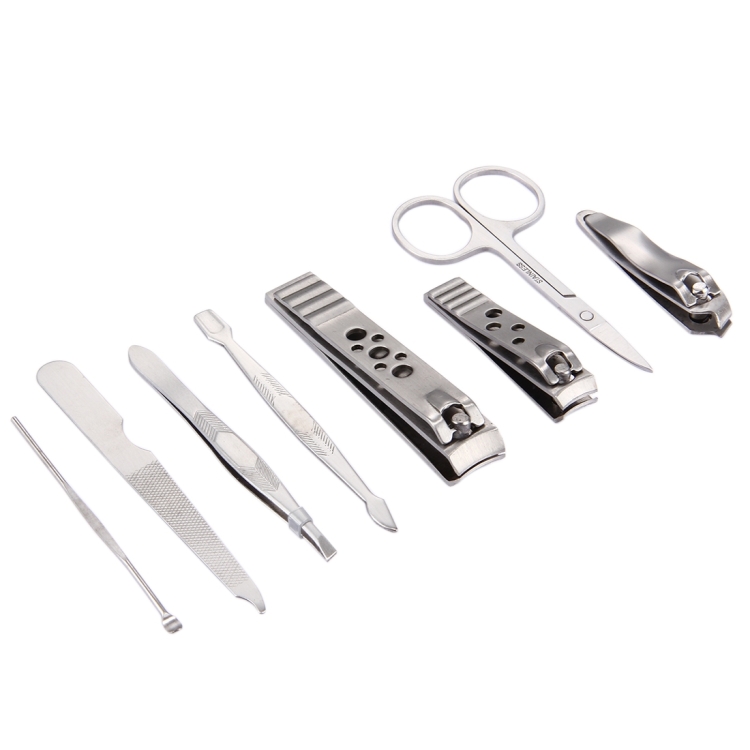 3. 8 pcs pruning contains large nail clippers, small nail clippers, finger nail nipper, scissor, nail file, eyebrow tweezers, ear pick, double side nail file, cuticle trimmer.