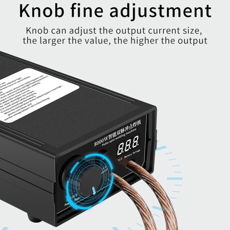 2. 8000W high power double pulse, two welding pens placed at the nickel piece, step on the foot switch does not let go, the red light flashes quickly 3 times, the output current once, complete welding