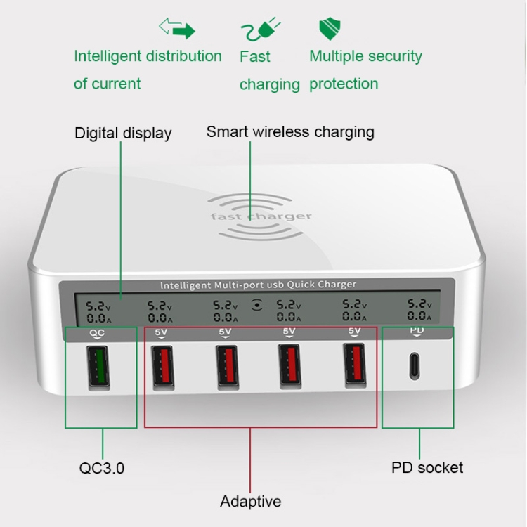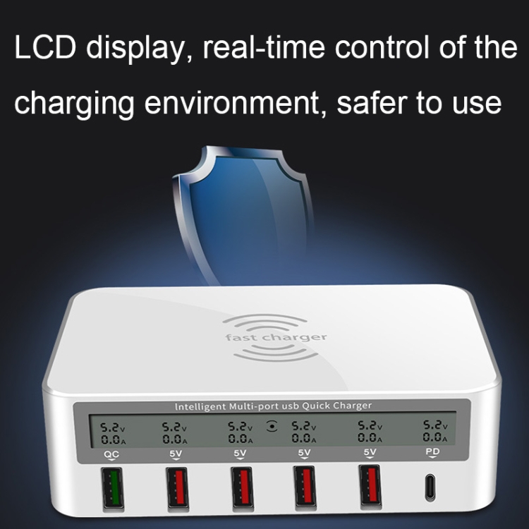 818PF 5 USB Ports + Type-C Smart Digital Display Wireless Phone Charger