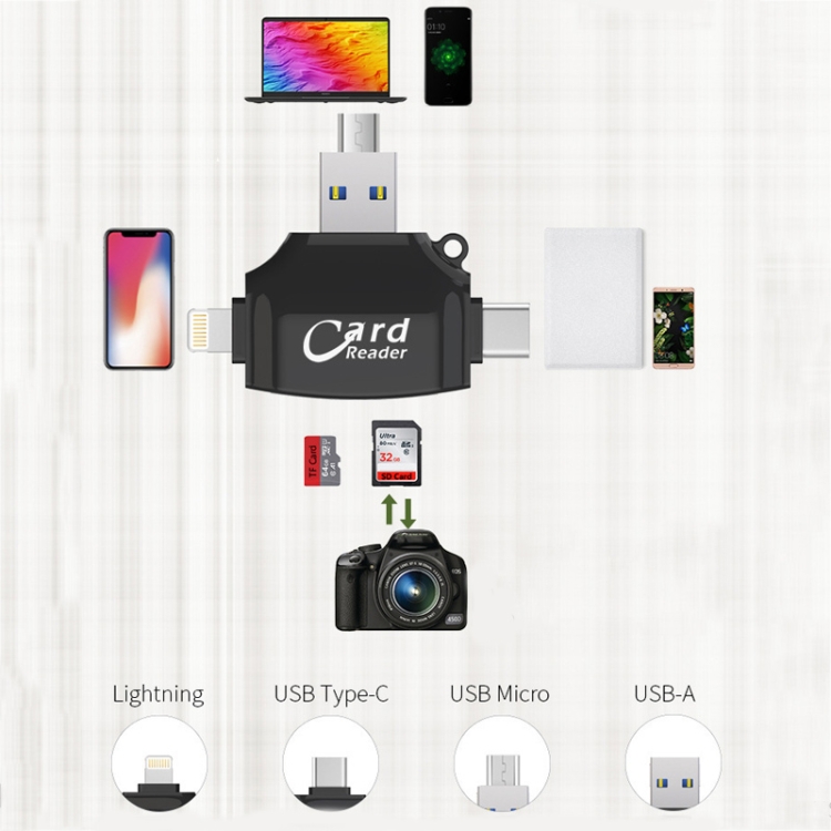 8Pin +Type-C+USB Micro+USB-A 4 In 1 Card Reader Supports Reading SD&TF Car