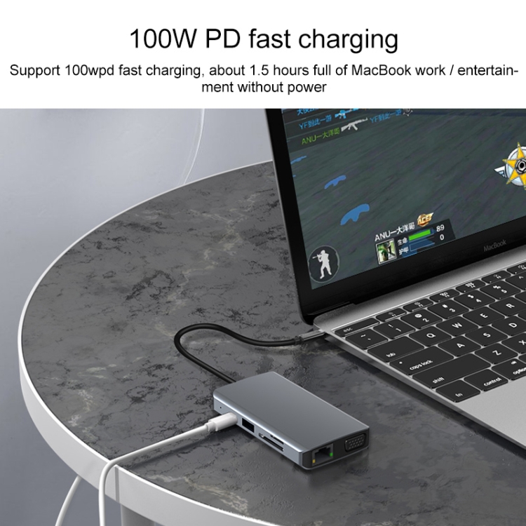 9 in 1 RJ45 + 100W PD + SD/TF + USBx2 + HDMI + VGA + 3.5mm AUX to Type-C HUB Adapter