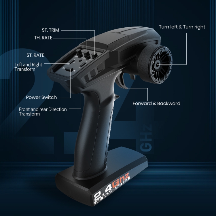 9. Stepless speed regulation, full proportional steering, extreme speed forward, backward, left turn, right turn, sudden braking, throttle fine-tuning, direction fine-tuning, anti-jamming protection, low-voltage protection.