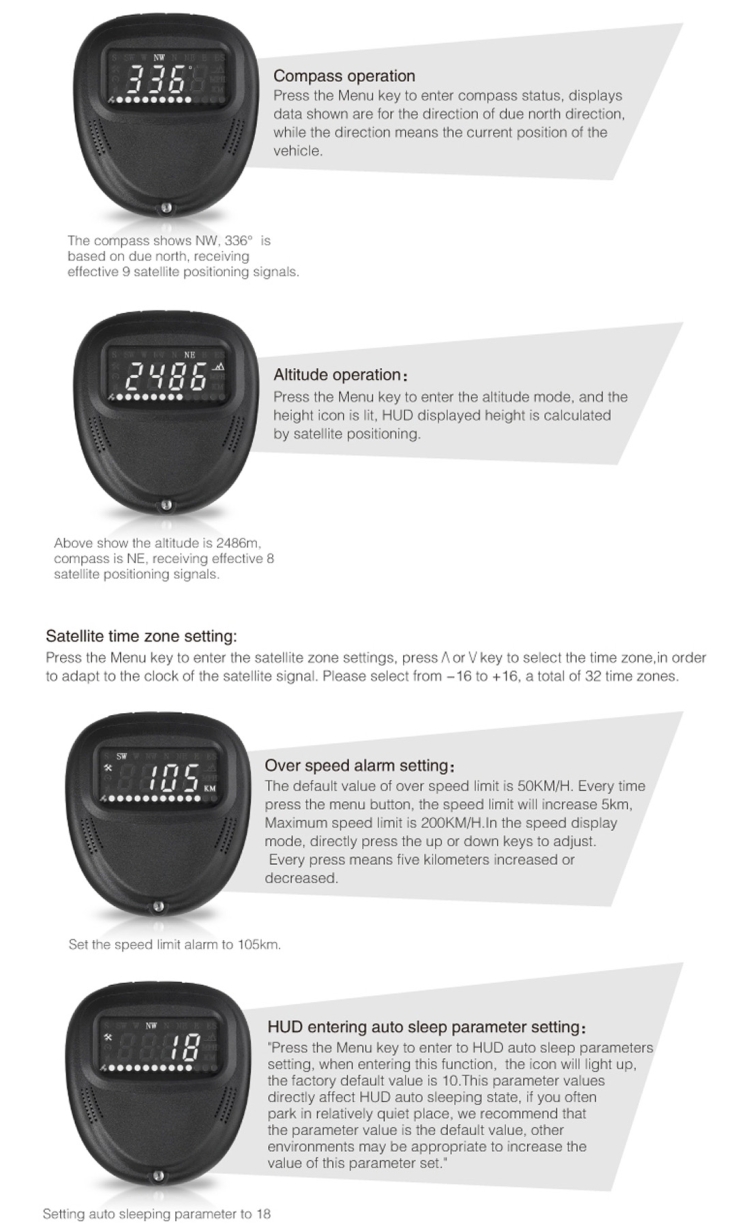 1. Display information: Vehicle speed, real time, over speed alarm, compass, altitude, auto sleeping mode.