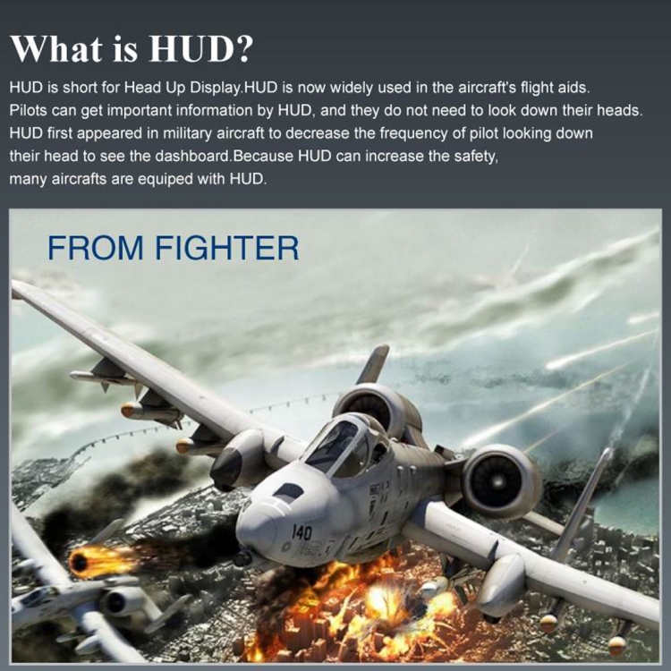 This product is for drivers’ safety, at high speeds, especially in high-speed driving at night, in order to avoid the driver to look down their head to watch the instrument, and decrease car accident. HUD is in extremely critical moment reflects its delicate care. HUD can project the important information displayed by the instrument (such as speed) onto the windshield, it can not only to help determine the speed of inexperienced novice to control their speed and avoid many of the speed limit road due to speeding violation. More importantly, it enables the driver instantly read the number in great vision and always make drivers eyes on the road in clear mind.