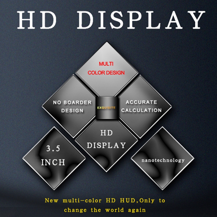 HUD short for Head Up Display. It displays driving datas on the front windshield such as speed on the car front window glass; Avoiding drivers unsafety because of watching the instrument while driving. Drivers can read the driving information instantly , and can always keep the best state on the way with HUD.