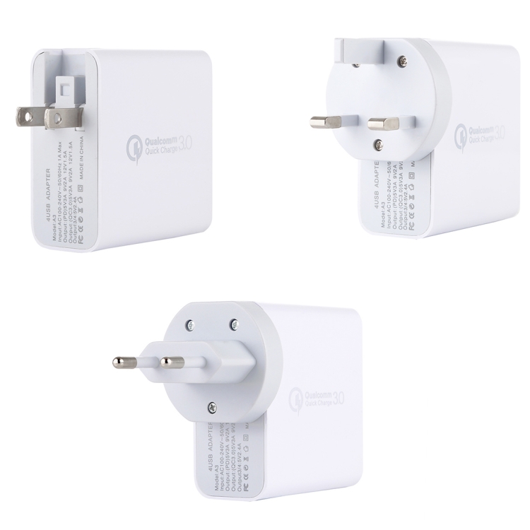 A3 PD 18W USB-C / Type-C + QC3.0 USB + Dual USB Interface Travel Charger Set, US Plug / EU Plug / UK Plug