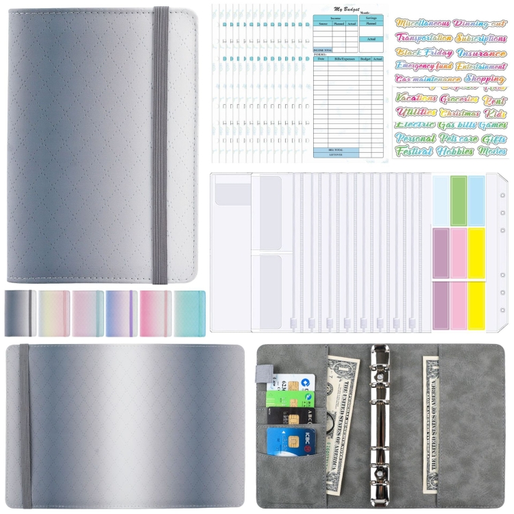 6. Set contains: 1 shell + 8 zipper pocket + 1 information pocket + 1 double pocket + 14 financial pages + 3 sheets gradient English stickers + 2 sheets colorful stickers