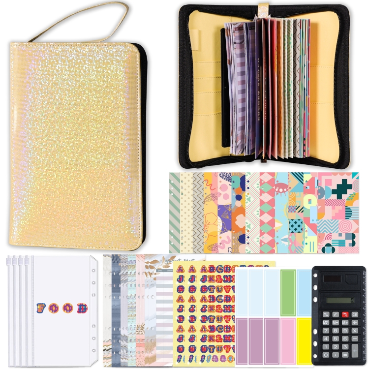 6. Set contains: 1 shell + 12 color envelope + 4 zipper pockets + 12 gold foil budget card + 1 calculator + 3 sheets sequins English stickers + 3 sheets 6pcs stickers