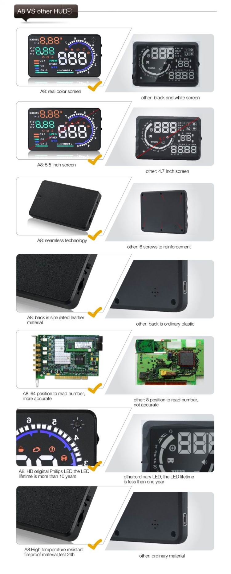 This product is for drivers’ safety, at high speeds, especially in high-speed driving at night, in order to avoid the driver to look down their head to watch the instrument, and decrease car accident. HUD is in extremely critical moment reflects its delicate care. HUD can project the important information displayed by the instrument (such as speed) onto the windshield, it can not only to help determine the speed of inexperienced novice to control their speed and avoid many of the speed limit road due to speeding violation. More importantly, it enables the driver instantly read the number in great vision and always make drivers eyes on the road in clear mind.
