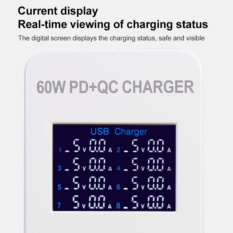 A8T 60W 8 Ports USB + QC3.0 + PD Type-C Smart Charging Station with Digital Display AC100-240V, AU Plug