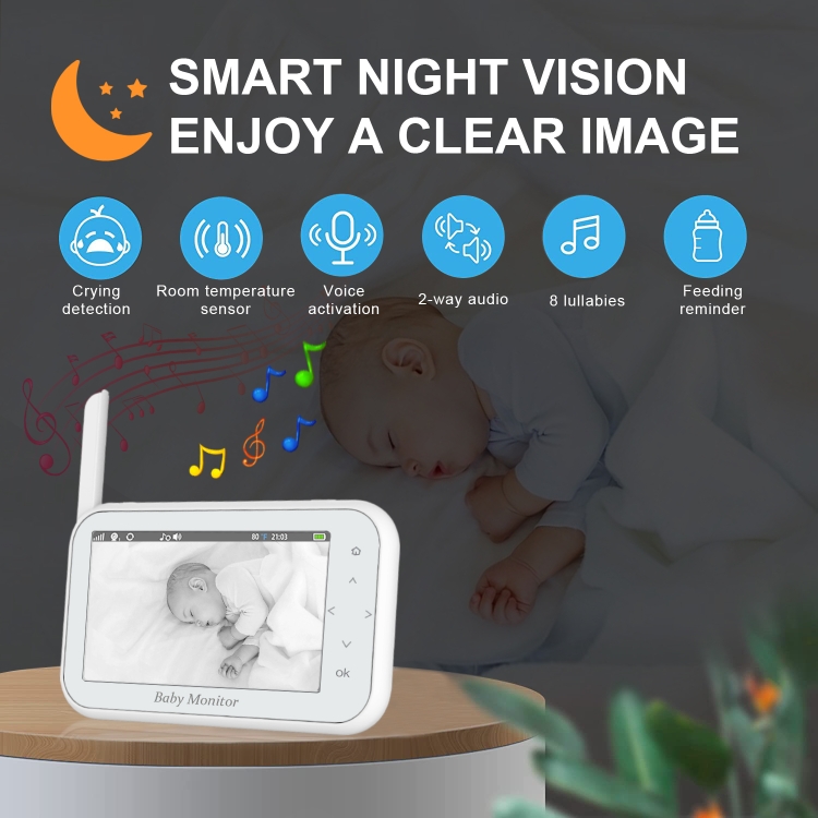9. Supports crying alarm, lullaby, feeding time reminder, automatic night vision, temperature alarm, and camera recording