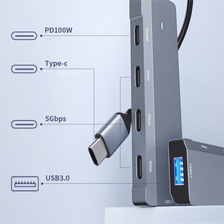 2. Ports: Type-C female 5Gbps x 3, USB female 3.0 x 1, PD 100W x 1