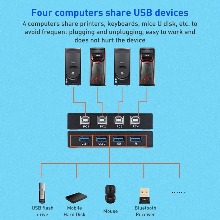 4. Downstream input port: 4-way USB-A interface: connect keyboard, mouse, scanner, printer, U disk, etc.