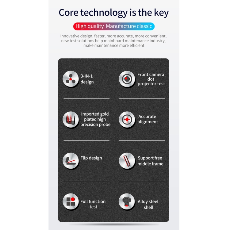 5. Support front camera dot projector test, test power on, display, touch, camera, flash, sensitivity, distance, online, WiFi, face recognition, signal, etc