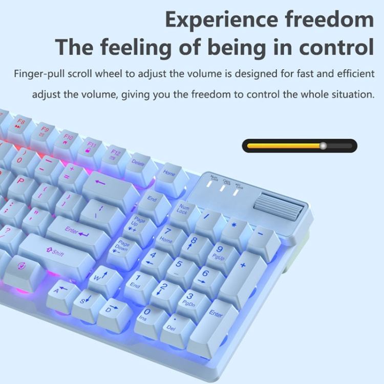 1. Fixed 19 keys without punching, metal bottom plate, multimedia combination, ergonomics, volume control wheel, mixed color light effect
