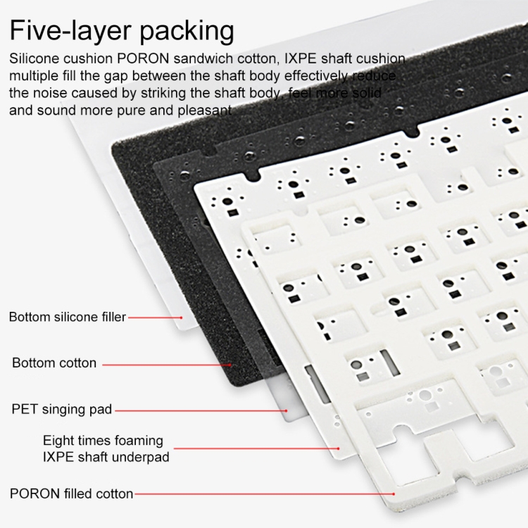 4. Gasket-mounted & Flex-cut PC Plate and PCB: Experience a typing feel like never before with our gasket-mounted design coupled with a Flex-cut PC plate and PCB. The gasket mounting method isolates the plate and PCB from the case, significantly reducing vibration and noise. In the meanwhile, the Flex-cut design in both the PC plate and PCB allows for a slightly flexy, yet stable typing experience. Every keypress is both cushioned and precise.