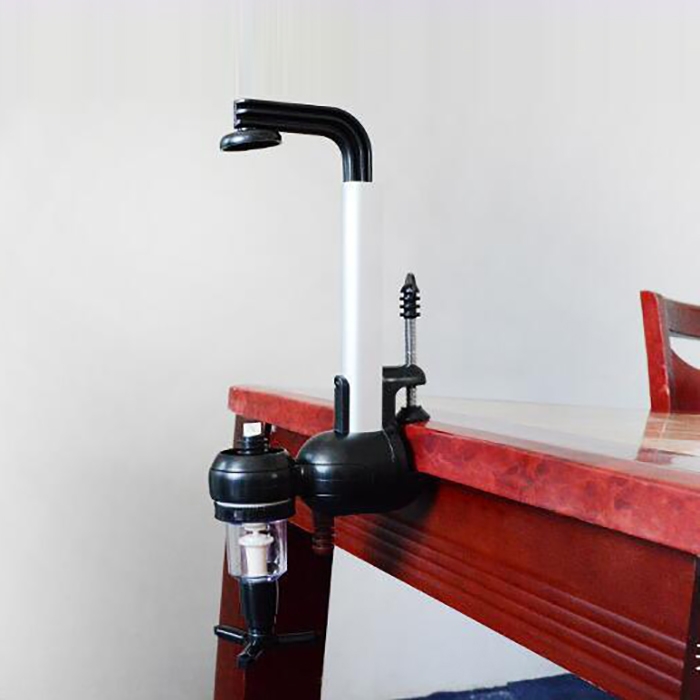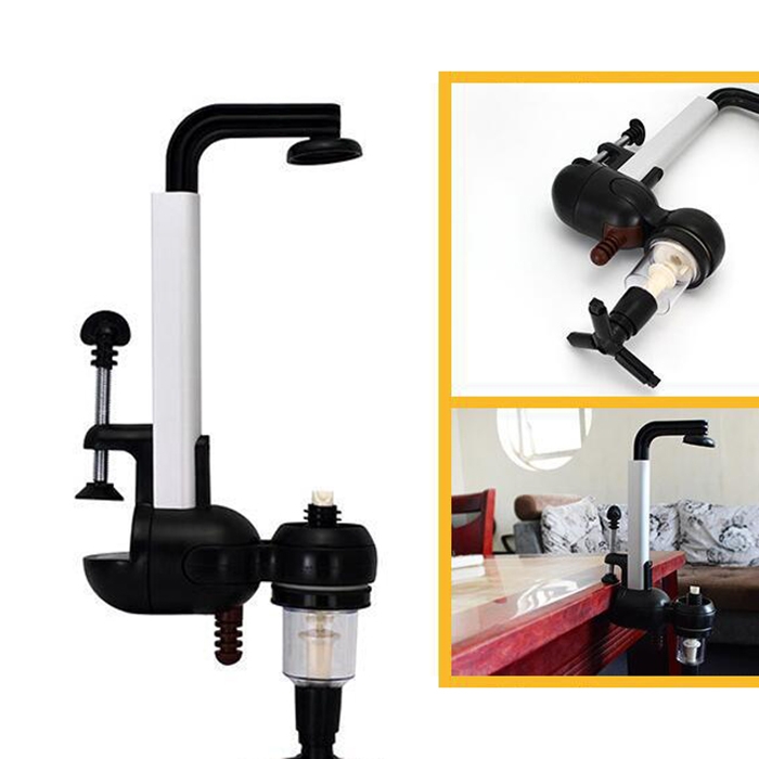 2) Has a spring-loaded receptacle that holds bottles of various sizes up to 1 liter