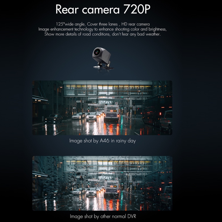 5. Functions: gravity sensing, loop recording, motion detection, parking monitoring, H.264 compressed files, 40-degree rotation of the lens