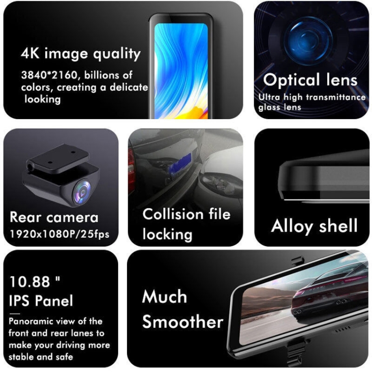 5. 4K + 1080P front and rear dual recording, front and rear split screen synchronization display
