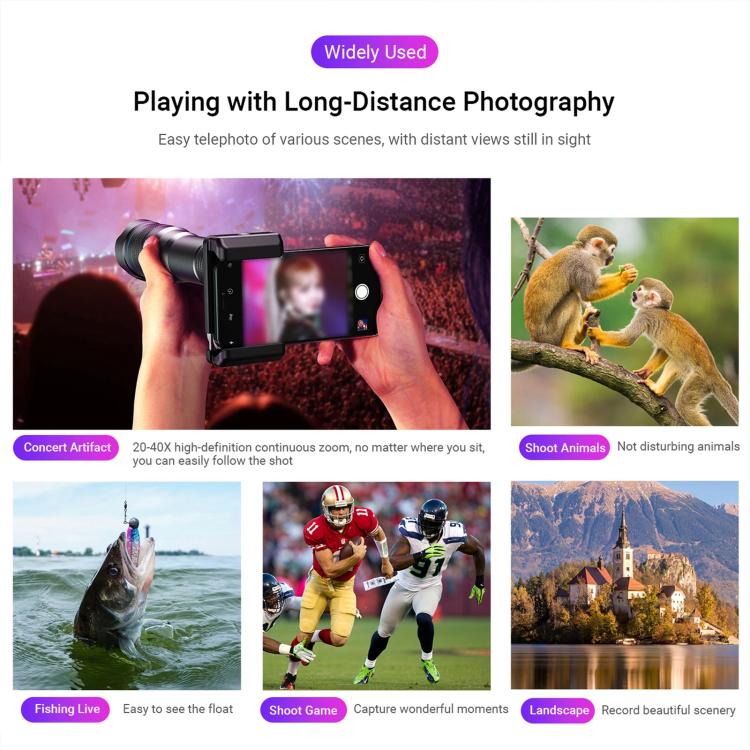 1. 20-40x mobile phone telephoto lens kit (including tripod), mobile phone long-distance shooting solution, integrated Schmidt prism optical system and all-metal structure, meeting high-definition shooting needs such as chasing stars at concerts, bird watching outdoors, and moon viewing in astronomy.