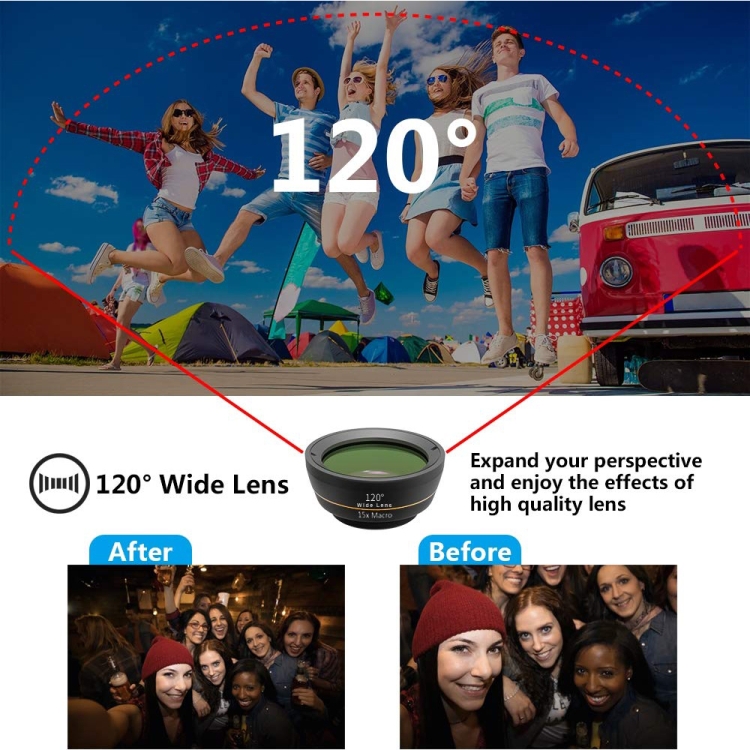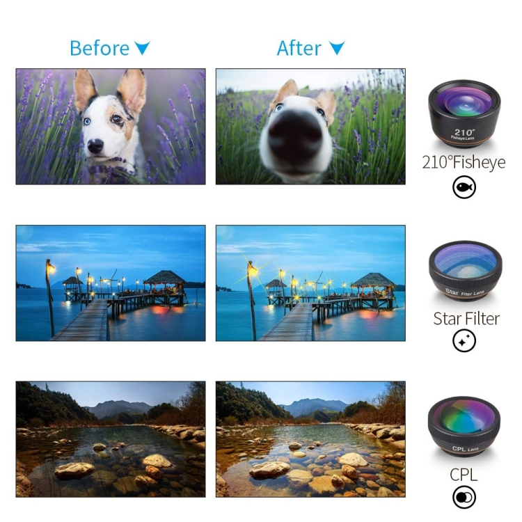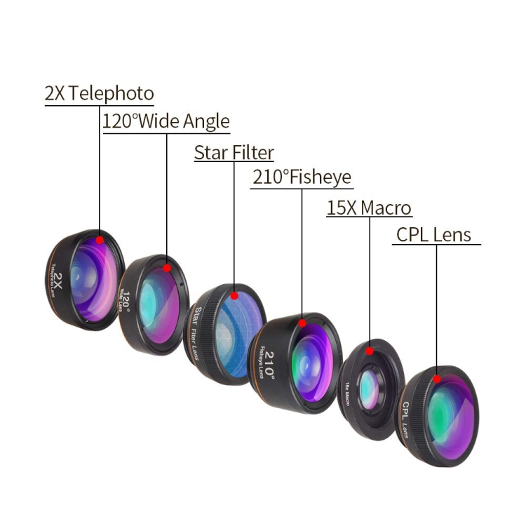 APEXEL APL-DG6V2 6 in 1 Universal External 2X Telephone+210 Degrees Fisheye+15X Macro+120 degree Wide-angle+CPL+Star Filter Lens