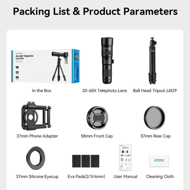 APEXEL TeleCular 3 20X-60X Zoom Lens Kit for Smartphones HD Super Telephoto Long-Range Shooting with Tripod Adapter