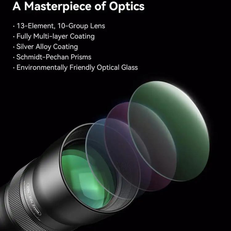 2. Ultra-high-definition picture quality, every detail is clear: full-surface broadband multi-layer coating on the lens; Schmidt roof prism, semi-pentagonal silvered reflective film, roof prism with anti-reflective coating; environmentally friendly optical glass. Every photo is a visual feast!