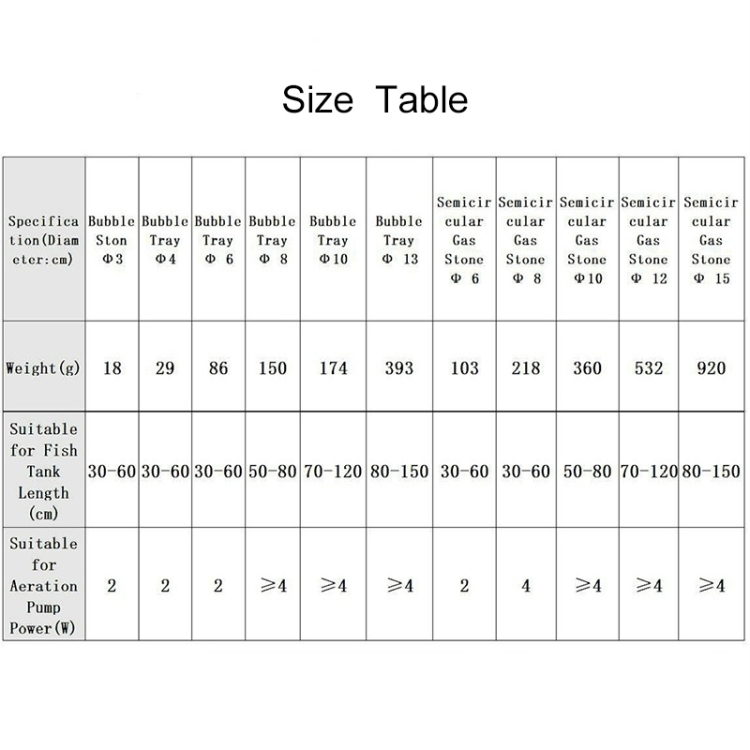 20 PCS 3cm Bubble Stone, 5 PCS 4cm Bubble Tray, 3 PCS 6cm Bubble Tray, 2 PCS 8cm Bubble Tray, 2 PCS 10cm Bubble Tray, 13cm Bubble Tray, 3 PCS 6cm Semicircular Gas Stone, 8cm Semicircular Gas Stone, 10cm Semicircular Gas Stone, 12cm Semicircular Gas Stone, 15cm Semicircular Gas Stone