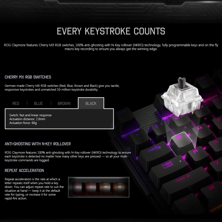 1. Mechanical black-shaft switch for comfortable touch and sensitive knock response, and durability to withstand up to 5000 keystrokes.