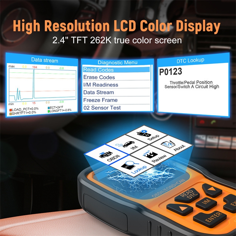 4. The OM126P car diagnostic tool is equipped with a 2.4-inch TFT 262K true color LCD display to show the test results, and the silicone keyboard allows you to easily access each menu option. The I/M Ready hotkey can check the status of emission readiness and driving cycle verification.