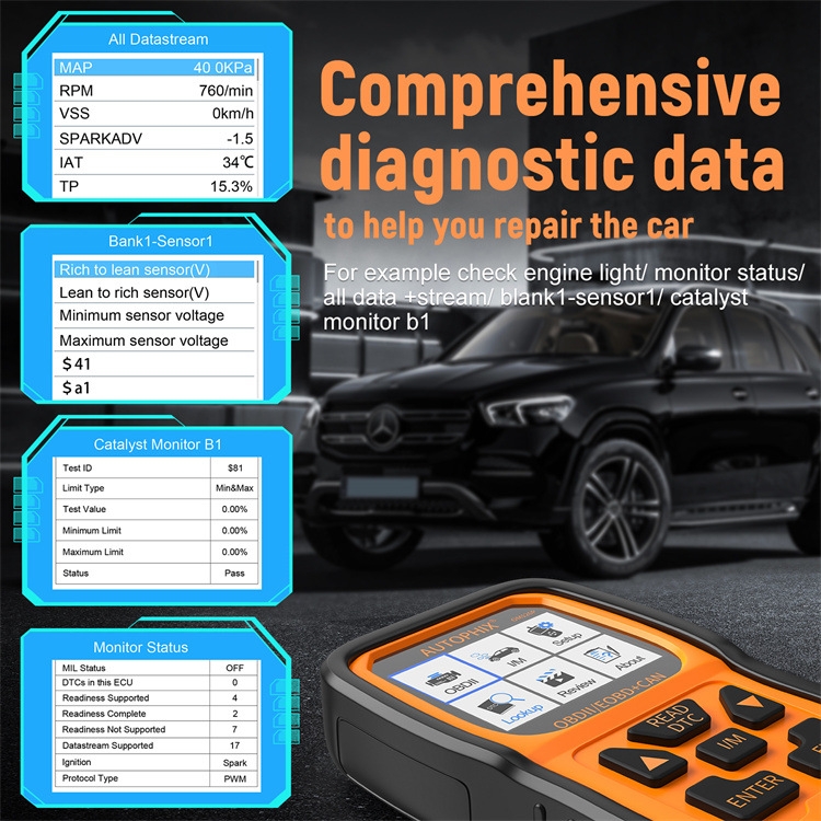 1. Built-in 14 special functions to read and erase stored emission related codes, pending codes, and display code definitions, data stream, freeze frame, onboard monitoring, and display vehicle information, I/M readings, view recorded DTCs, view and print reports.