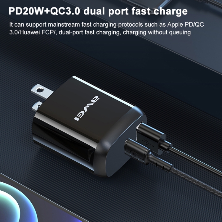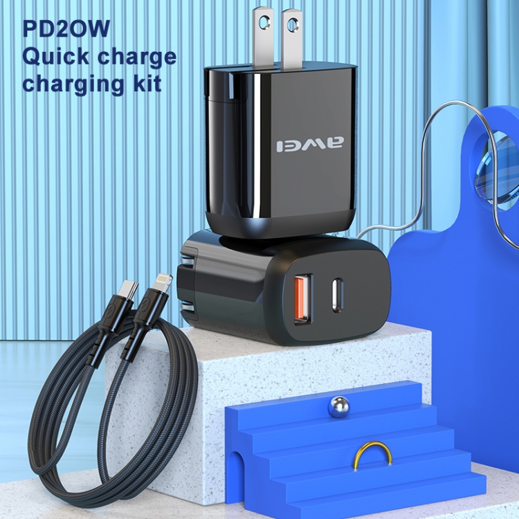 awei PD3 20W PD Type-C + QC 3.0 USB Interface Fast Charging Travel Charger with Data Cable, US Plug