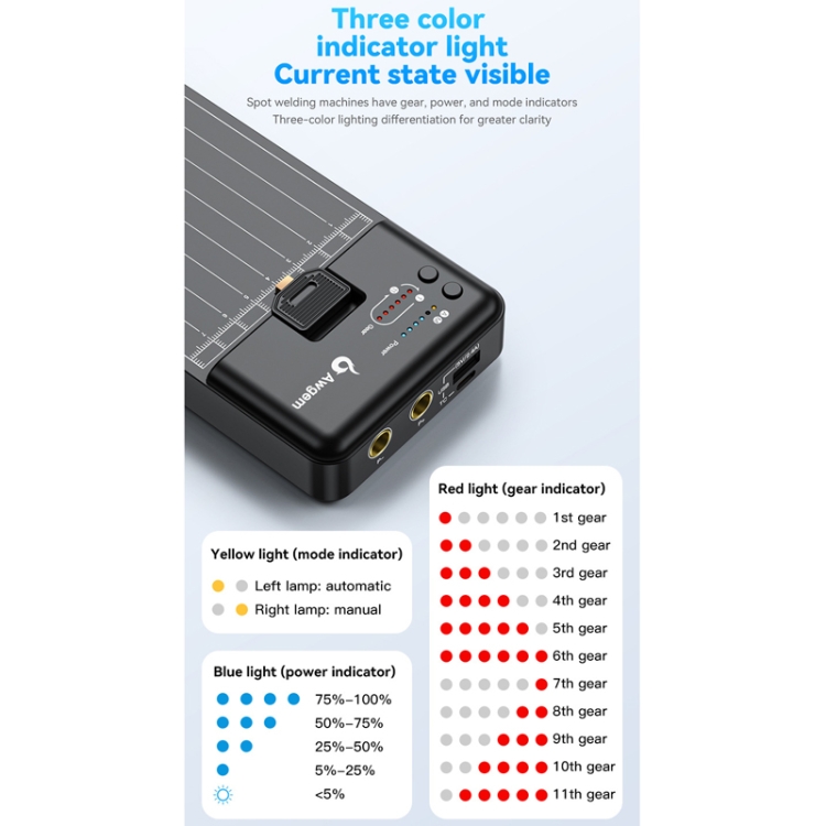 7. The current status of the three-color indicator light is visible, the spot welder has gears, and the power and mode indicator lights are distinguished by three-color lighting, which is clearer