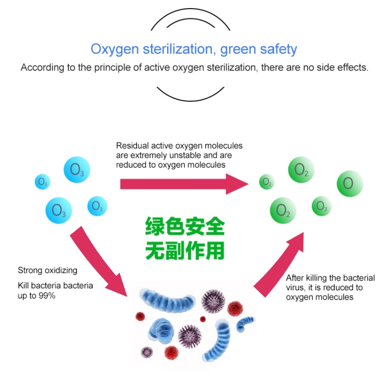 2. Removing the strange smell: Ozone can remove speedily the pressure oxygen bacteria which produce all kinds of strange smells, avoiding strange smell appearing.