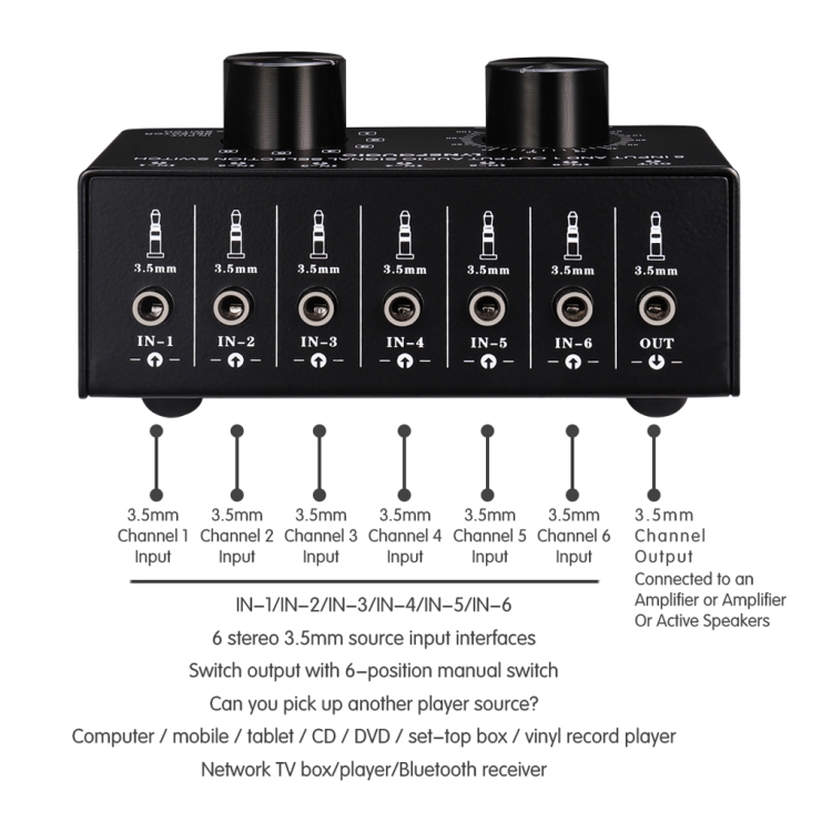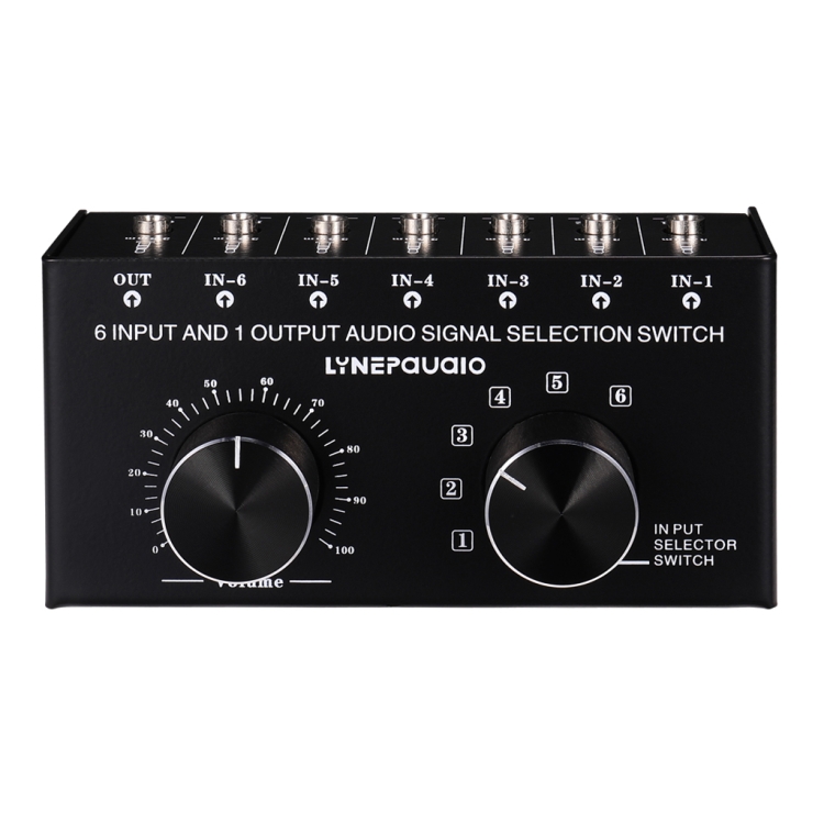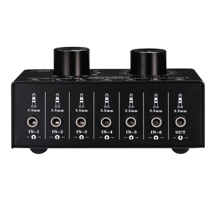 The product uses standard 3.5mm interface design for input and output, and uses precise 6-level manual switch design for the switcher, with independent stereo volume adjustment control.