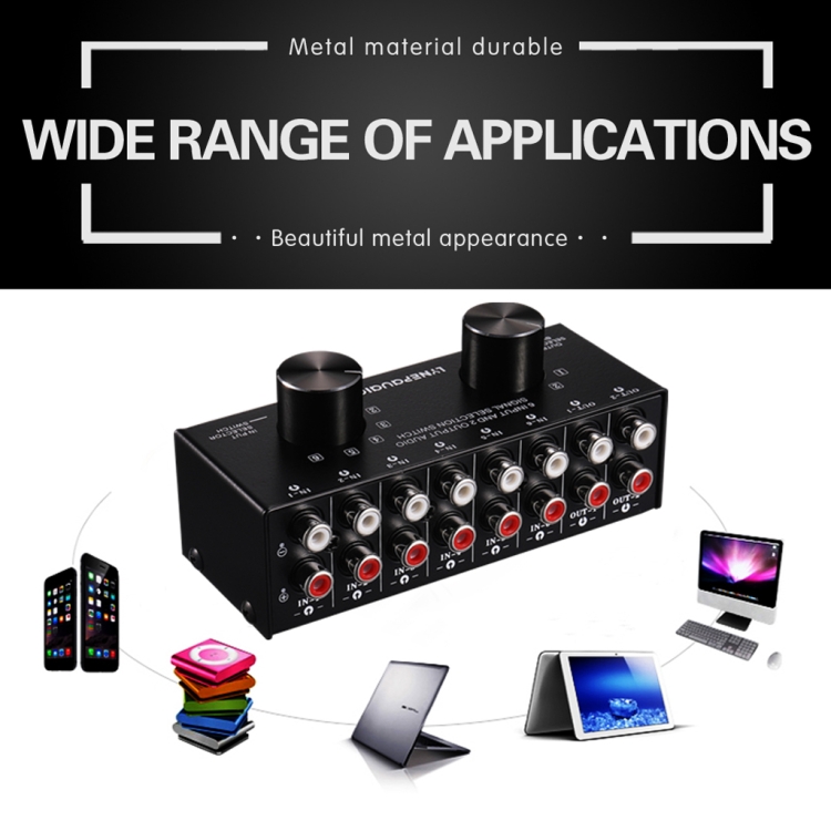 The product is mainly used to select and switch among a variety of stereo signal input and output through a common set or multiple sets of equipment, that is, a variety of stereo signal sources of devices, such as TV audio, MP3 player, CD player, video game, mobile phone, tablet, computer, record player, need to be output on the amplifier or on active speakers,