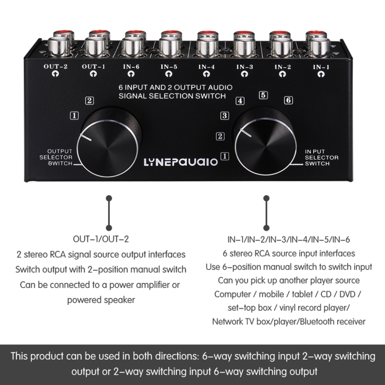 The product uses standard RCA port design for input and output, and uses precise 6-level and 2-level manual switch design for the switcher,