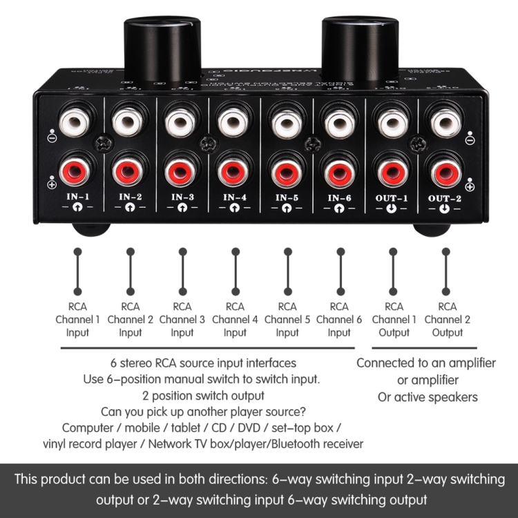 6 input 2 output or 2 output 6 input stereo audio signal selection switcher, with RCA port design