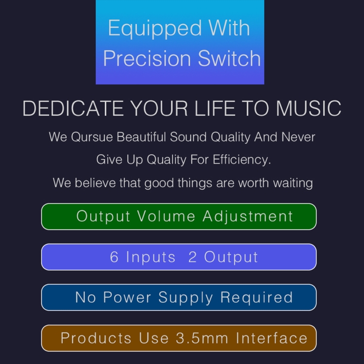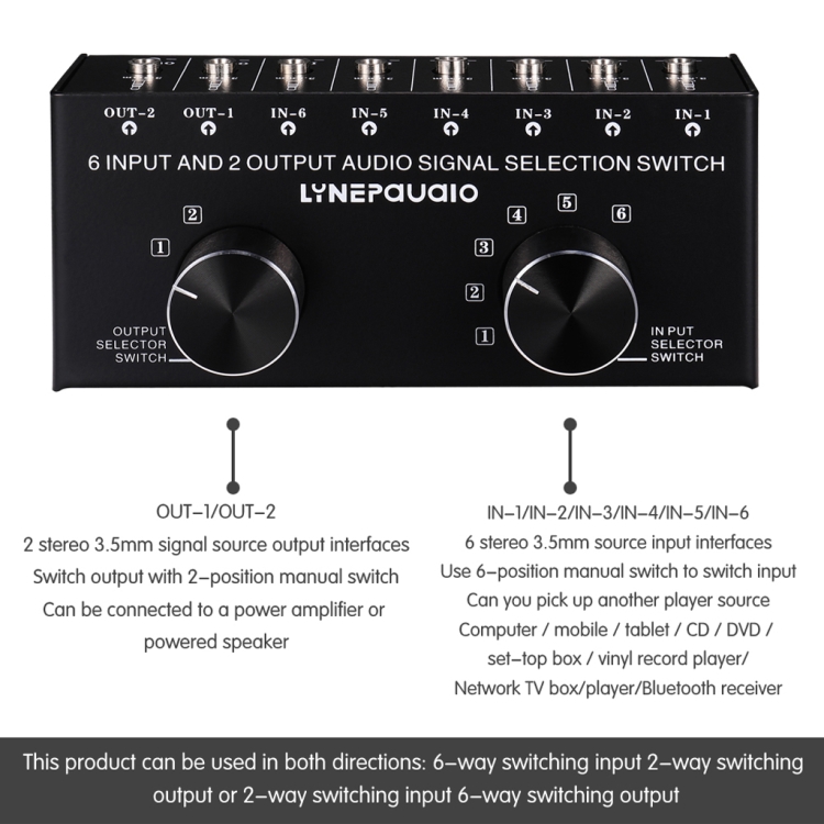 The product uses standard 3.5mm interface design for input and output, and uses precise 6-level and 2-level manual switch design for the switcher,