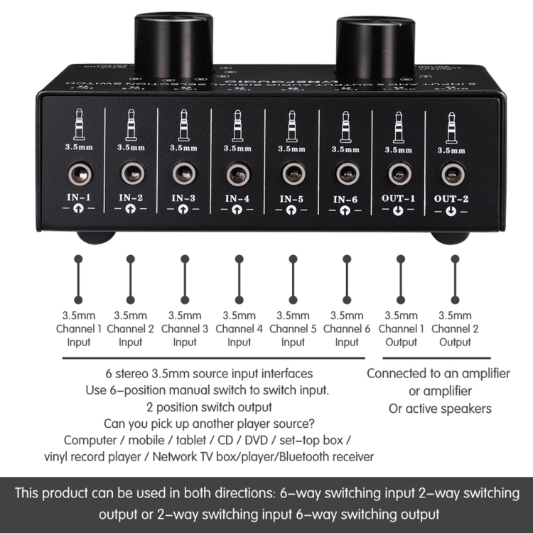1 X 6 input 2 output or 2 input 6 output stereo audio signal selection switcher 3.5mm interface