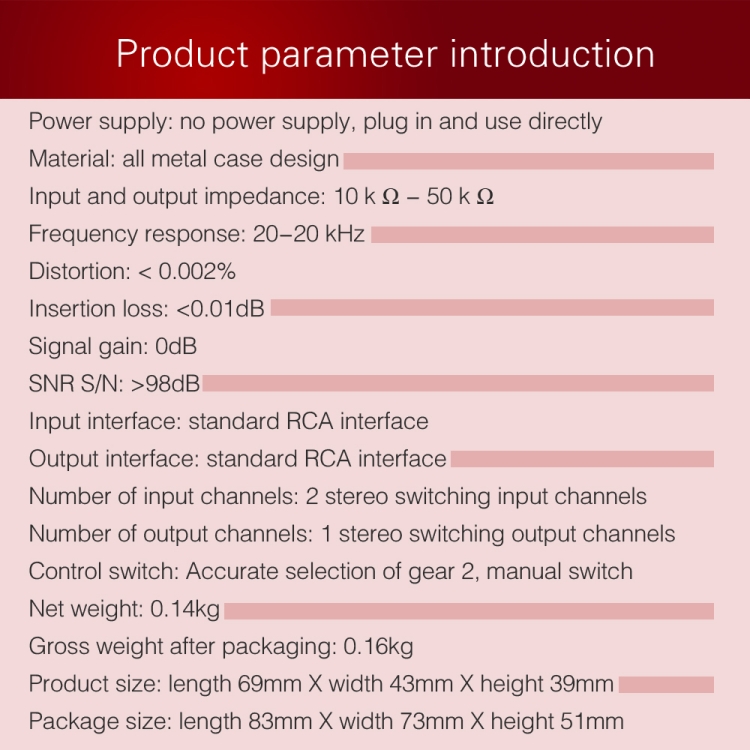 4. RCA interface design is used for product input and output standards, and the switch is designed with manual push-button switch of precise 2 positions.