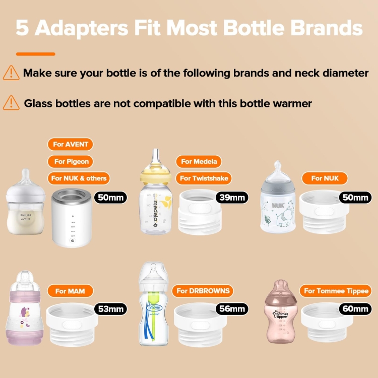 6. Portable bottle warmer includes 5 adapters (39mm/50mm/53mm/56mm/60mm), suitable for most bottles.